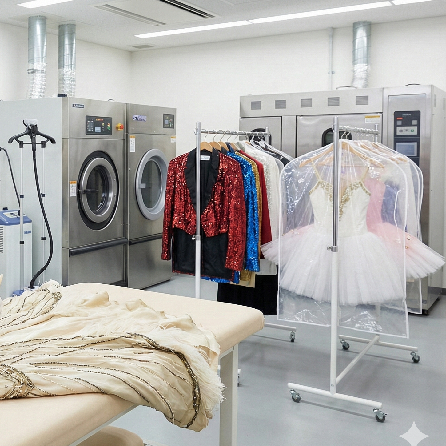 舞台衣裳・ダンス衣裳・時代劇衣裳など、特殊素材・特殊製法・精密構造の衣裳に特化した専門クリーニングを提供します。